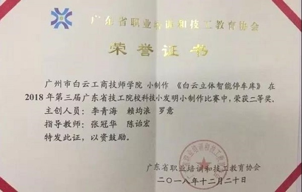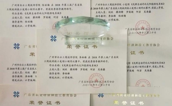 12月20日,第三屆廣東省技工院??萍夹“l(fā)明小制作比賽決賽精彩上演,我校參賽的6個優(yōu)秀作品統(tǒng)統(tǒng)獲獎。其中,機電系派出的兩個參賽隊伍經(jīng)過激烈的角逐,張冠華、陳詒宏老師指導的“立體智能停車庫”小制作項目榮獲二等獎;李柏雄、陸麗梅老師指導的“光照自動尋向太陽能供電系統(tǒng)”小發(fā)明項目榮獲三等獎;四位老師也榮獲“優(yōu)秀指導老師”獎。